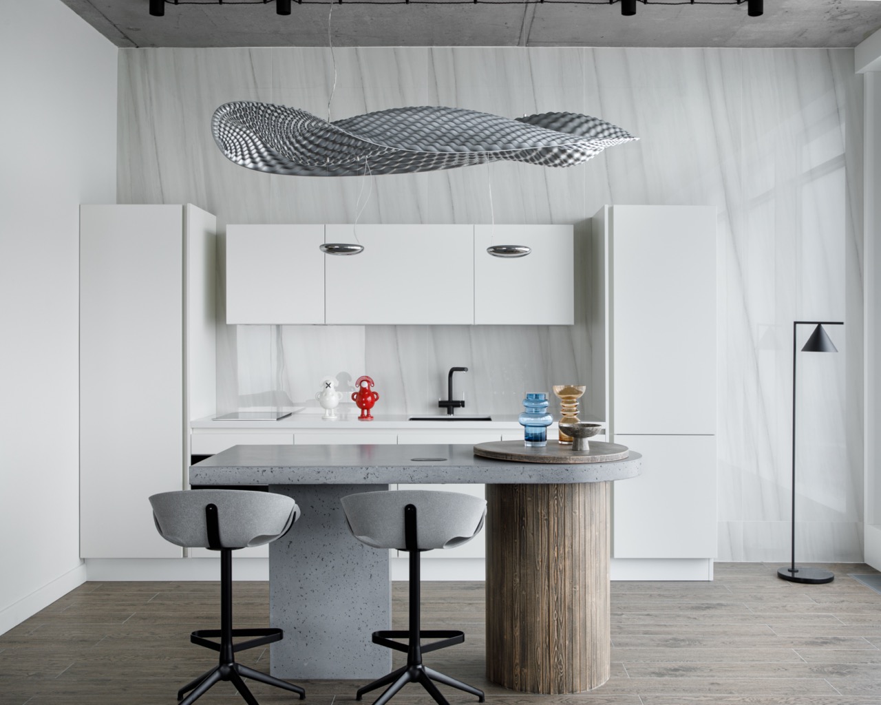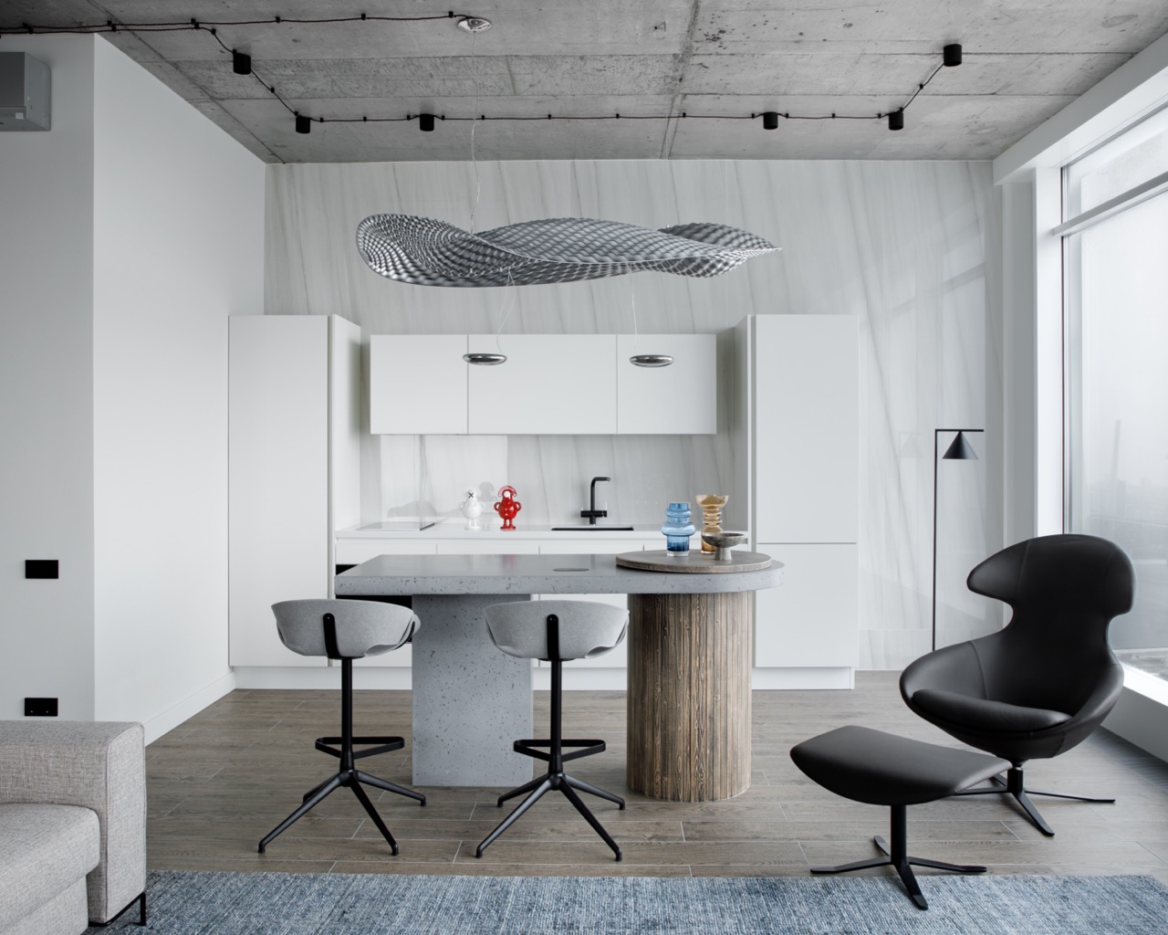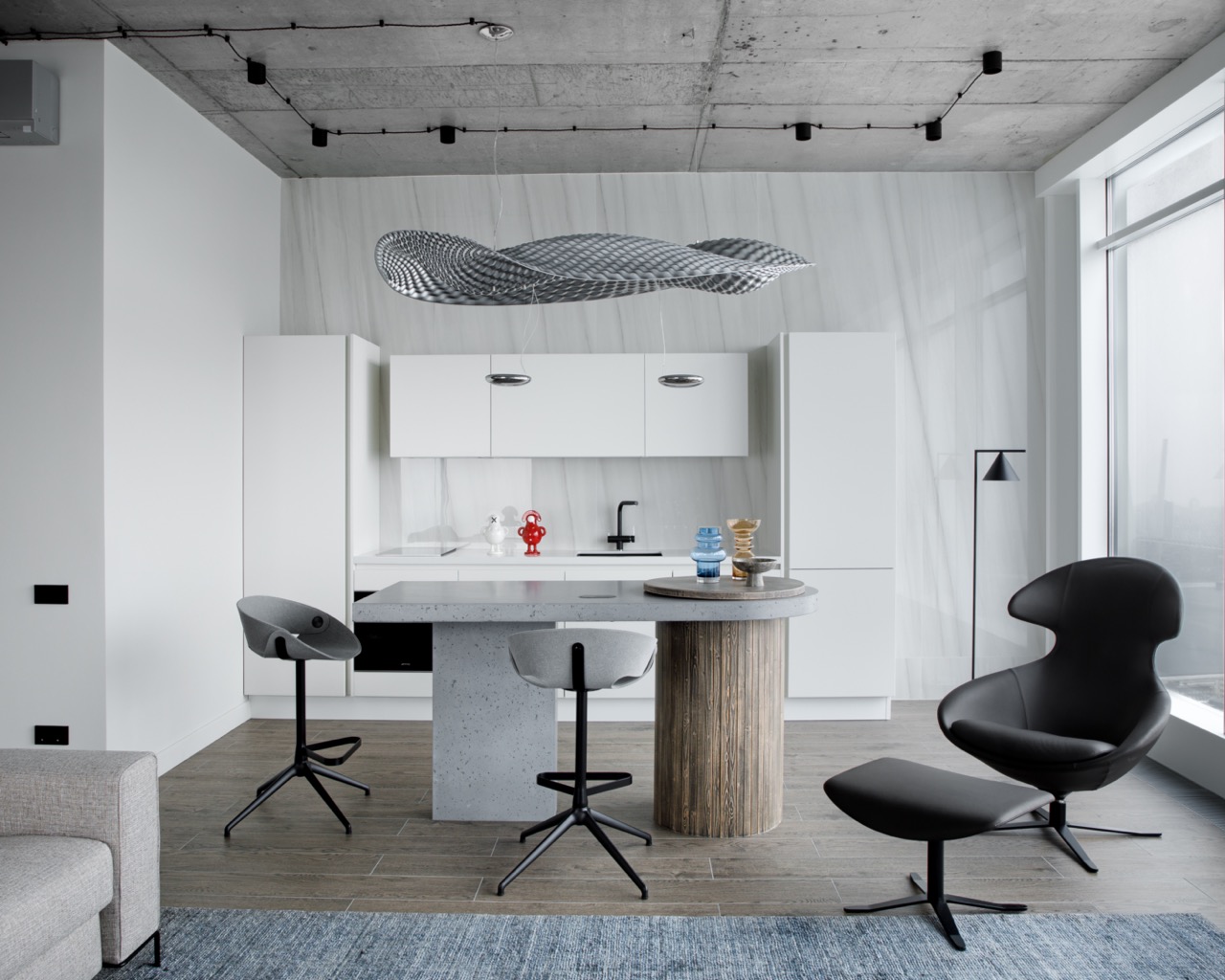 Планиировку от застройщика мы изменили под задачи нашего клиента и узаконили. В итоге у нас получились просторная кухня-гостиная, спальня, гардеробная, санузел и ванная комната. Нам было важно не перегрузить интерьер мебелью, она, во-первых, должна была быть функциональной, а во-вторых — смотреться легко и необычно. Одним из примечательных предметов стал стол-остров на кухне, его для проекта изготовили индивидуально по нашим чертежам, второго такого точно нет. Еще одно удачное решение — «умная» дверь от компании Portalle: она позволяет открывать ее по отпечатку пальца или по заранее запрограммированному коду.