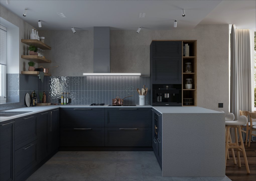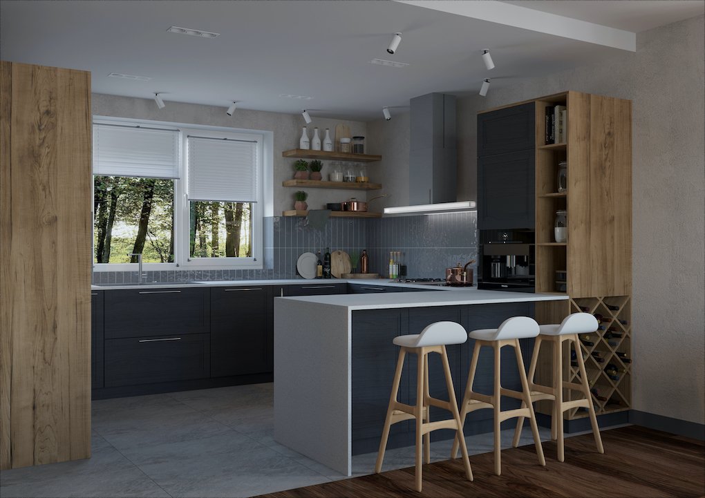 В процессе работы мы постаралась совместить классические мотивы отделки с деталями стилей лофт и минимализм. Так, кухонный гарнитур и все шкафы для хранения исполнены в современном минималистичном прочтении: гладкие фасады преимущественно со скрытыми или незаметными ручками. Классическую отделку зоны столовой разбавляет слэб на балясинах. На полу используется натуральный камень, сланец. В отделке стен спальни классические панели использовали в сочетании со штучным паркетом и рейками разной ширины. Кабинет визуально зонирован на две части: в рабочей зоне стены и потолок бетонные, поддерживают стилистику лофта; в диванной же, напротив, продолжается классическое оформление: ровный белый полоток и серые стеновые панели, обрамленные молдингами.
