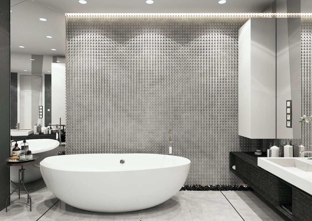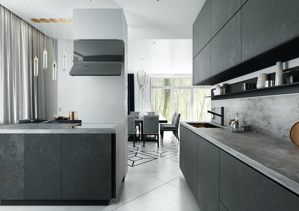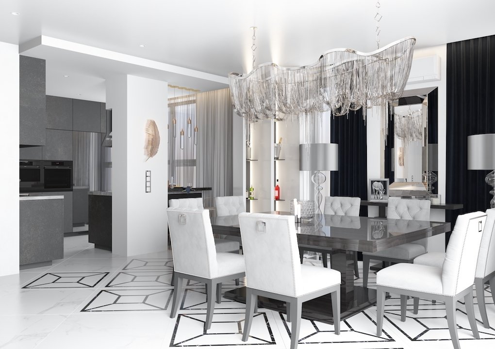 Центральным помещением в квартире выступает кухня-столовая и гостиная. Стеклянной перегородкой с распашными дверьми отделен кабинет (одновременно гостевая спальня).