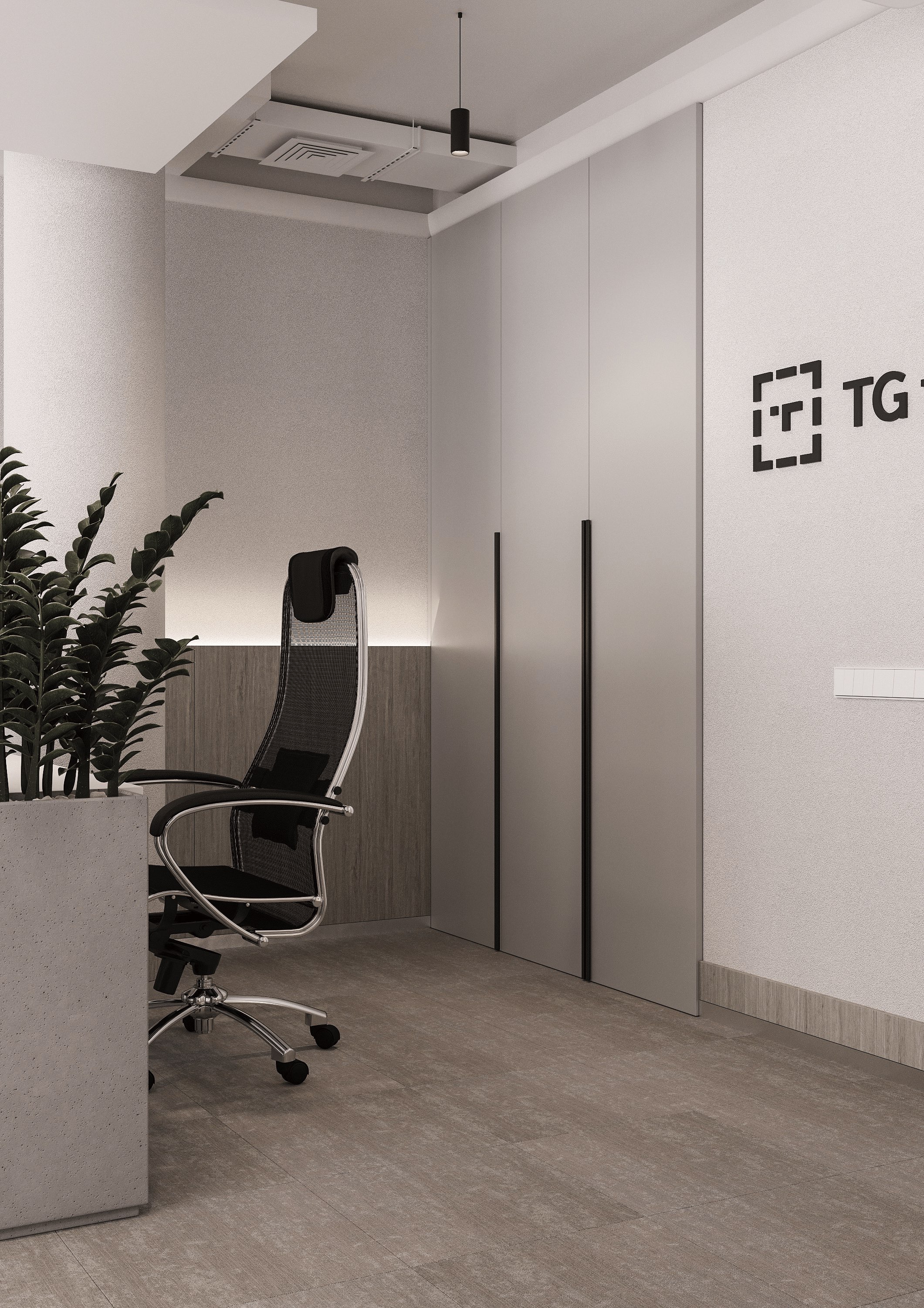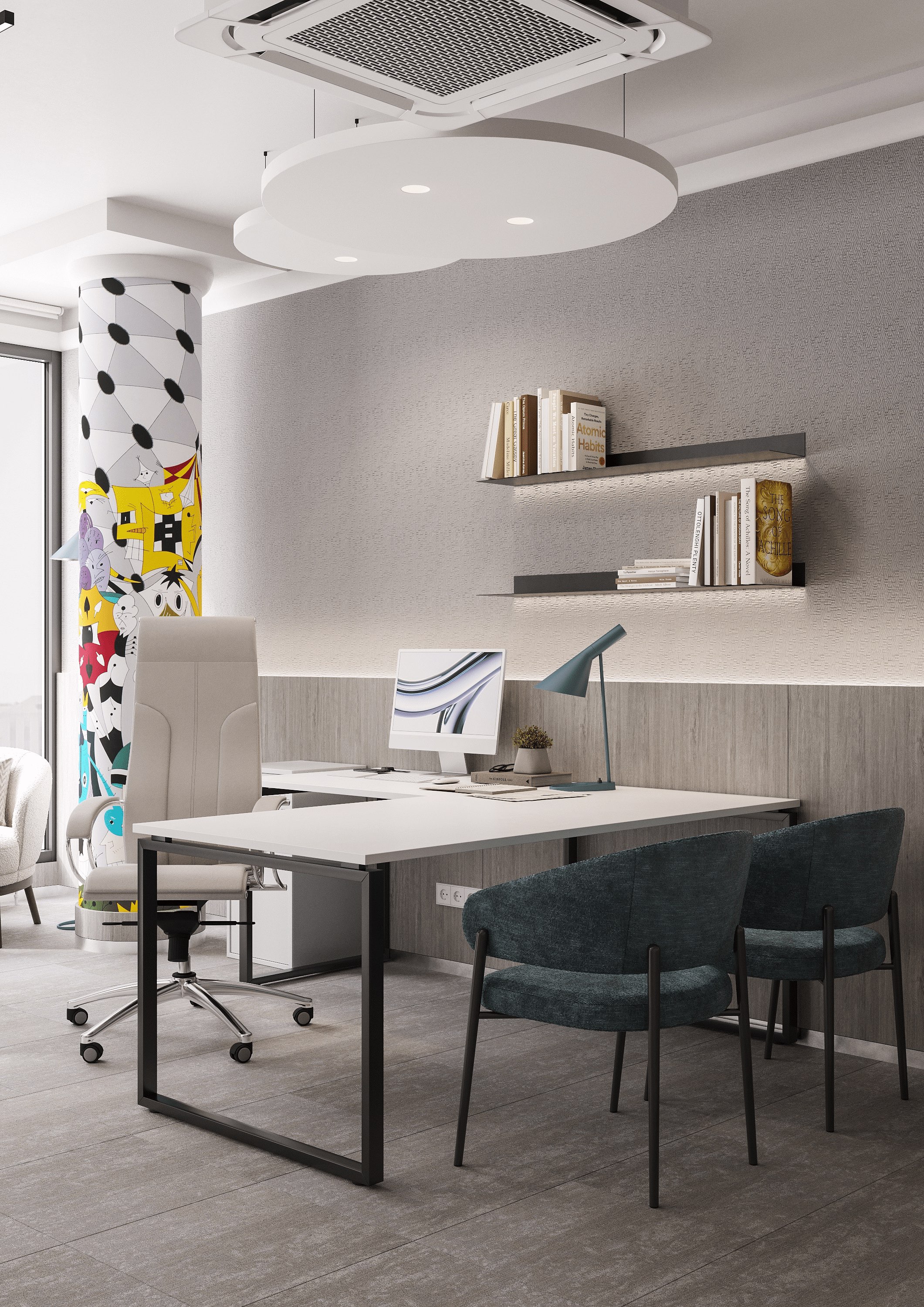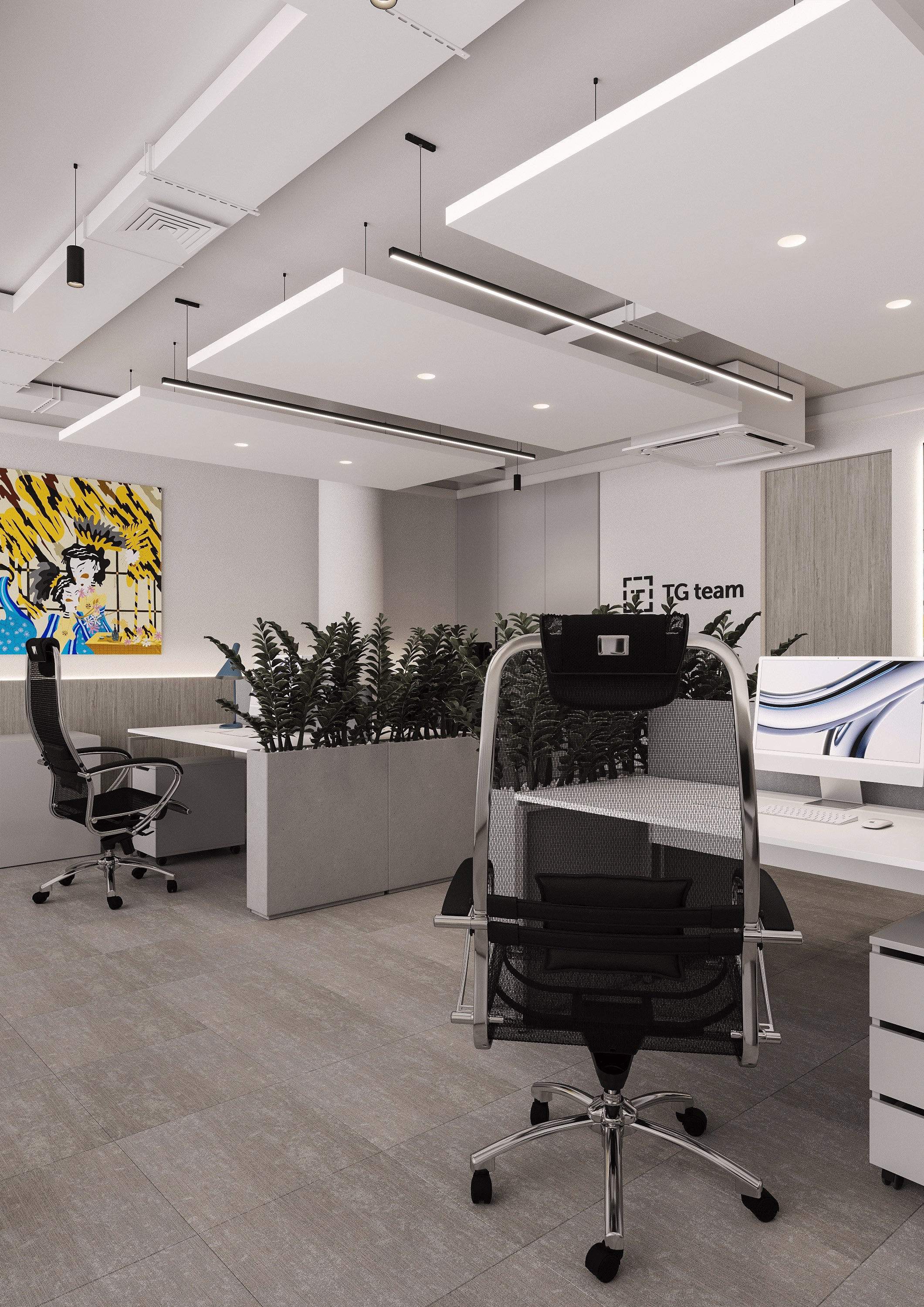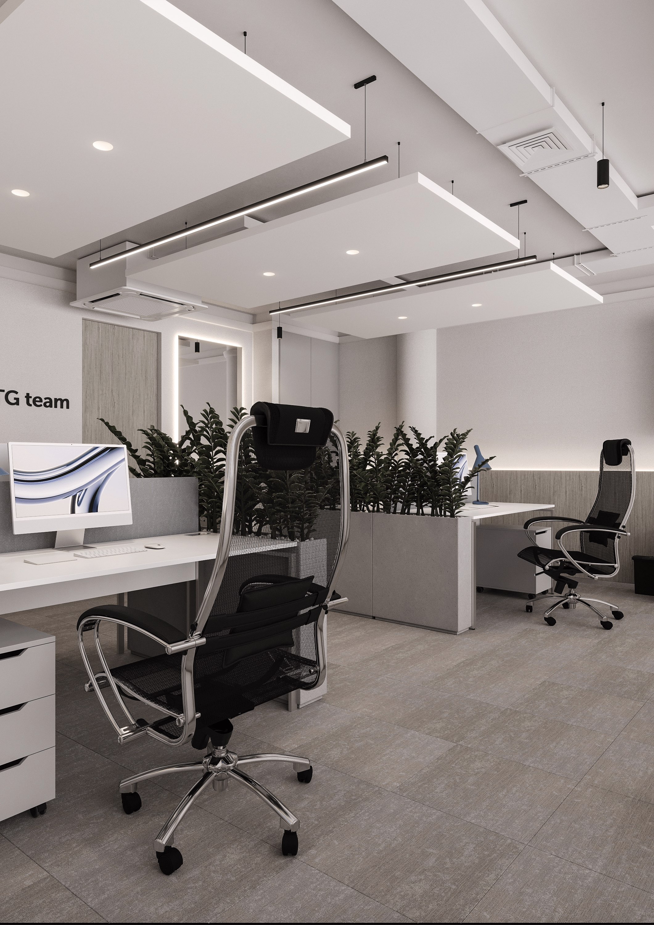 Реализована современная система освещения с многоуровневым сценарием — от общего до акцентного, встроенного в потолочные конструкции. Установлены кондиционирование, вентиляция и электрика с продуманной разводкой под рабочие места.