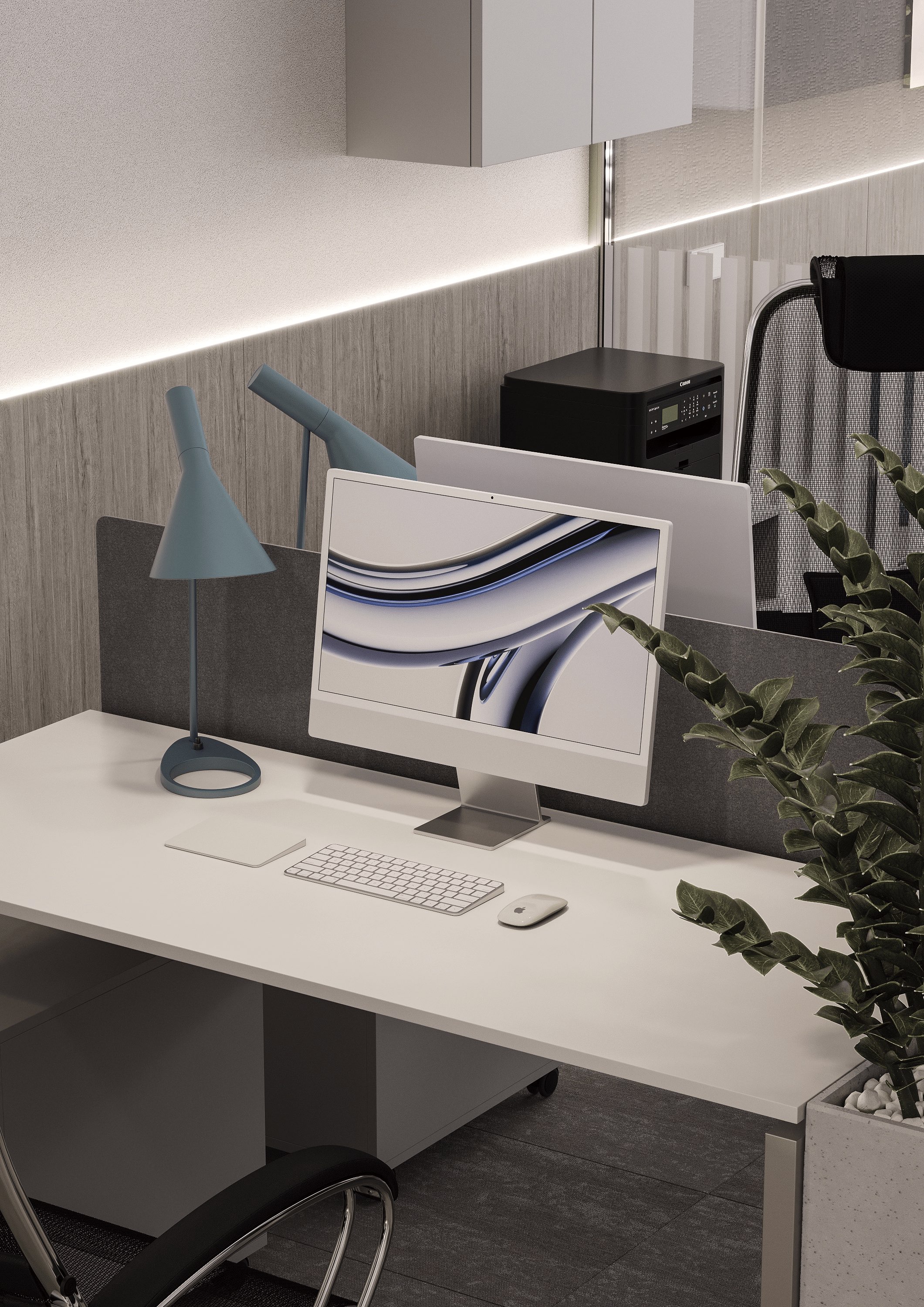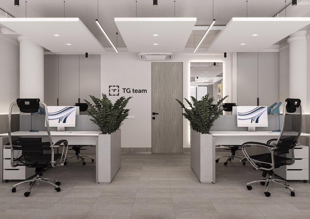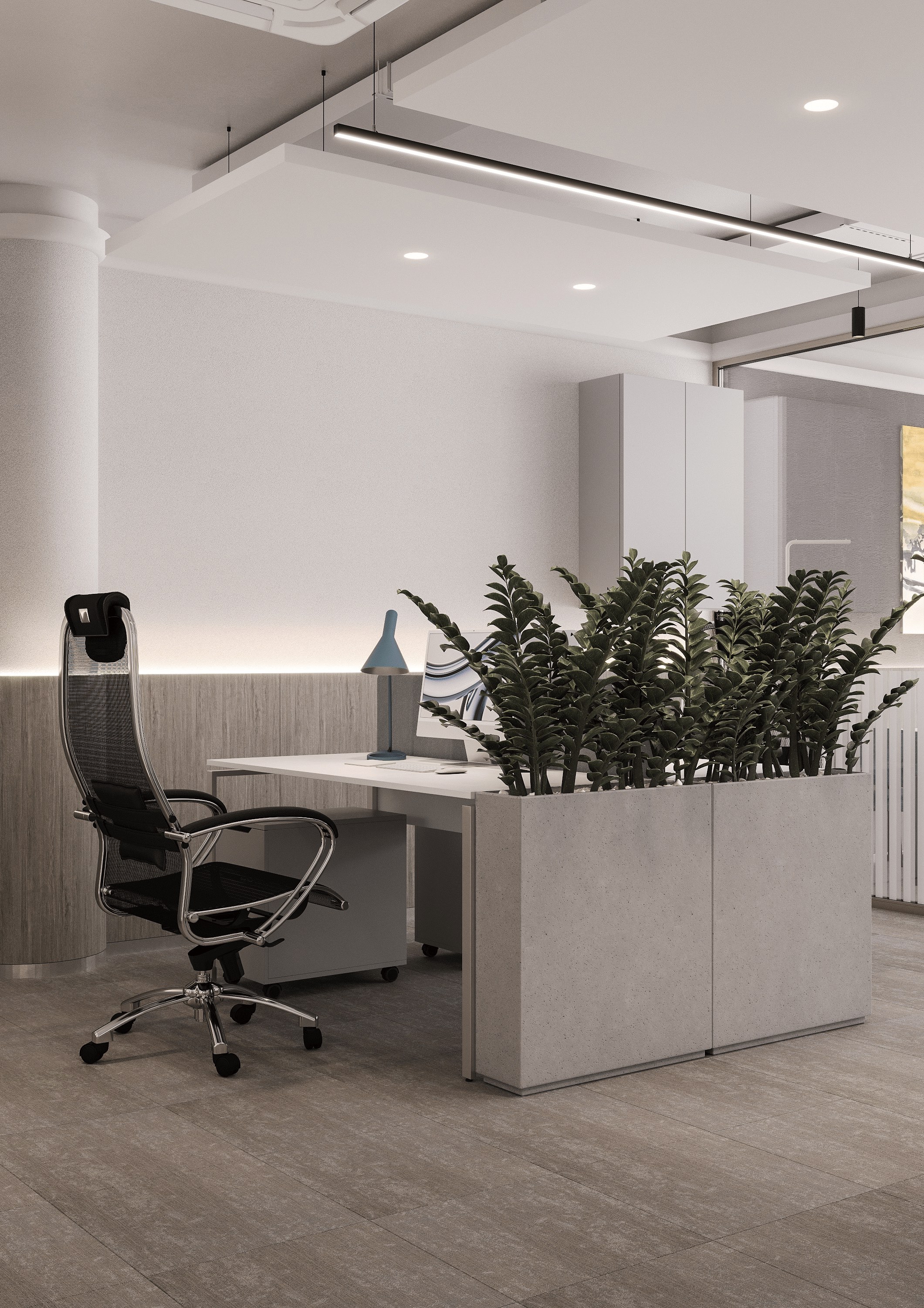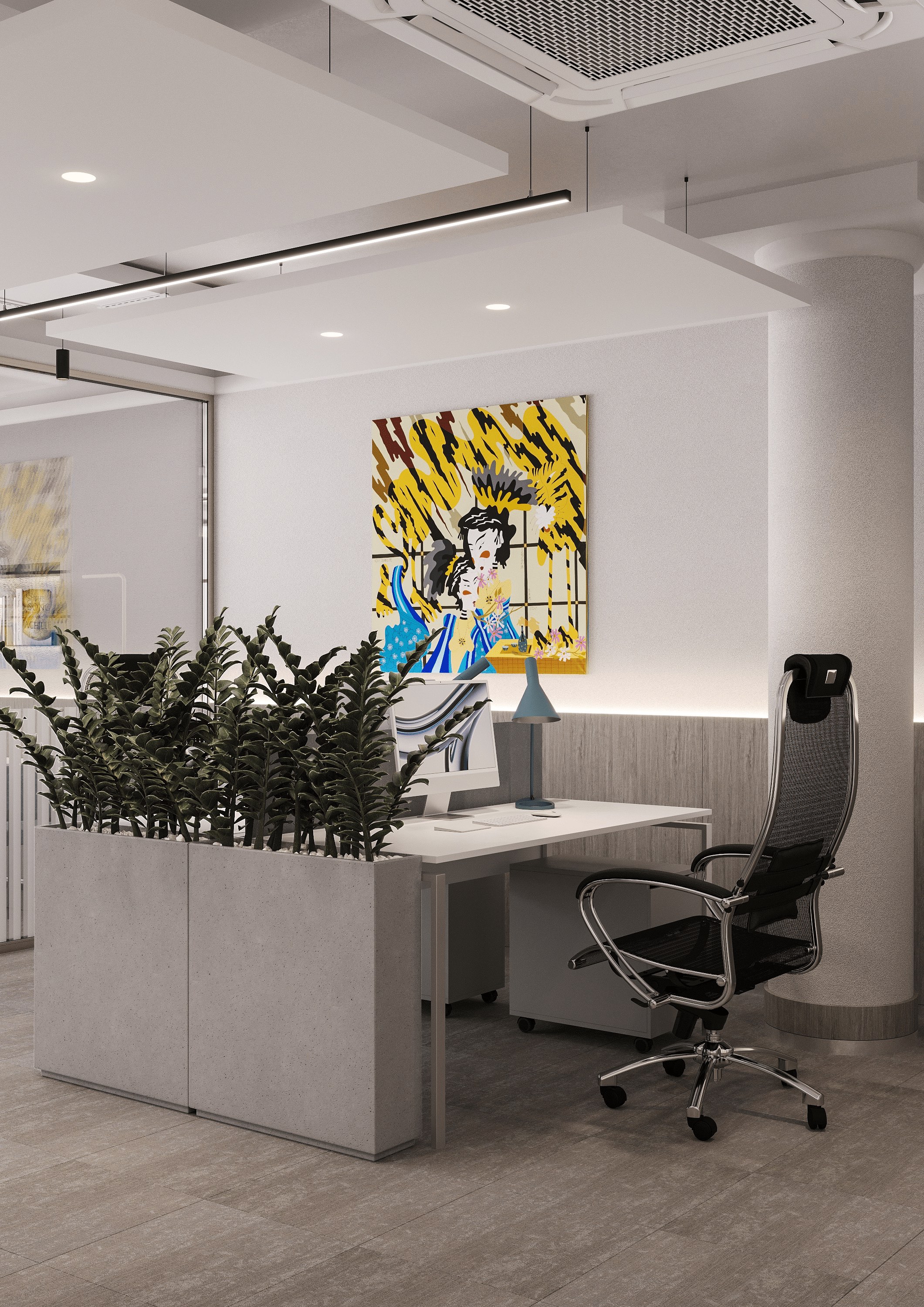 Реализована современная система освещения с многоуровневым сценарием — от общего до акцентного, встроенного в потолочные конструкции. Установлены кондиционирование, вентиляция и электрика с продуманной разводкой под рабочие места.