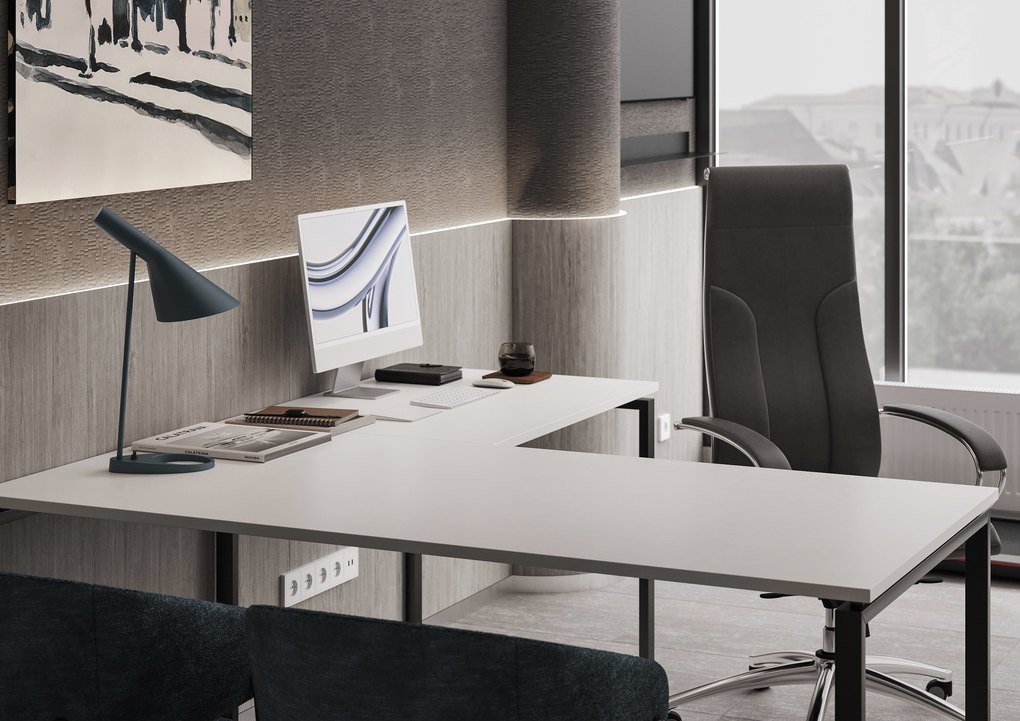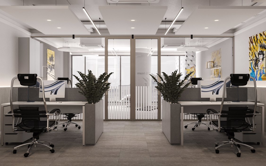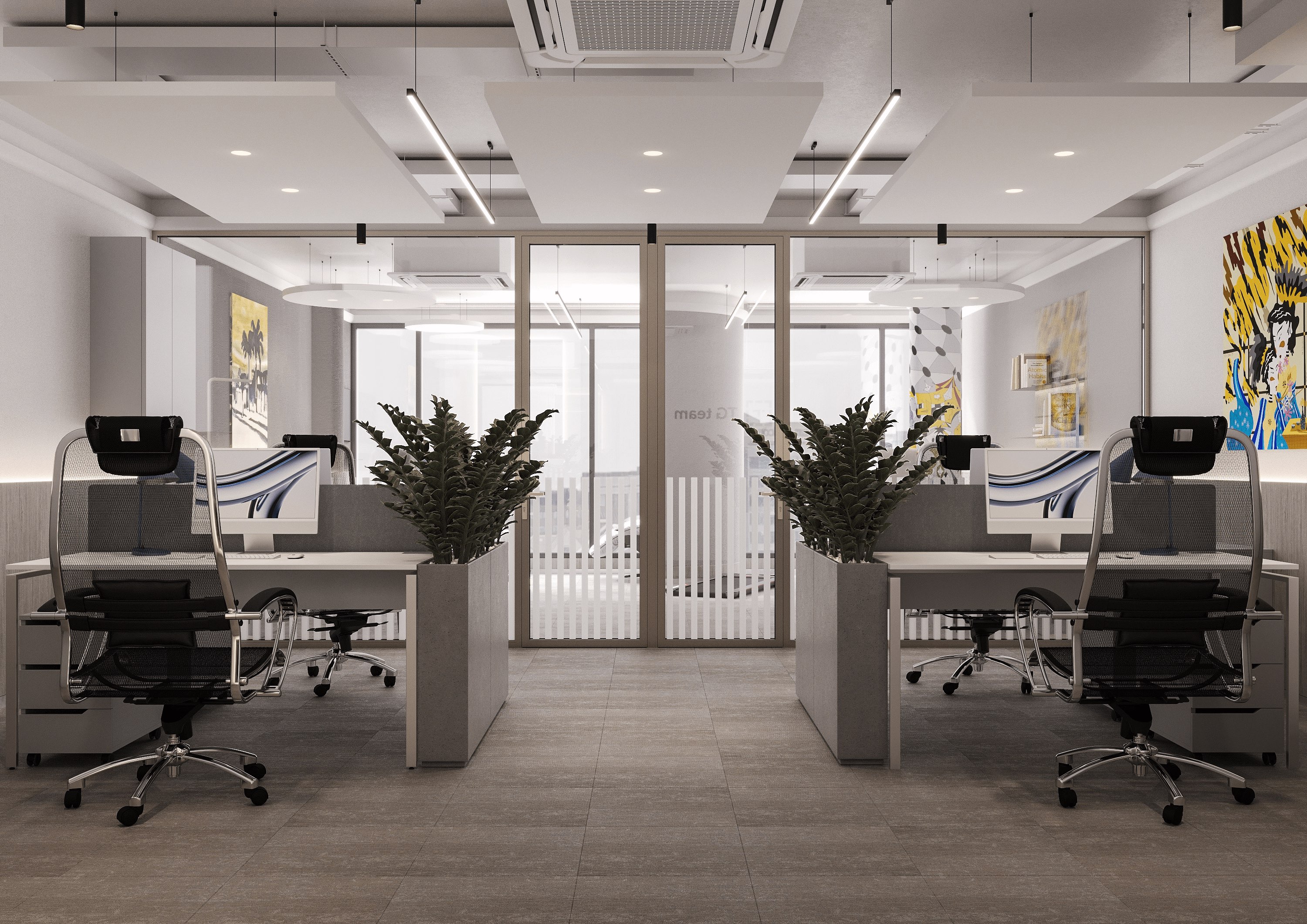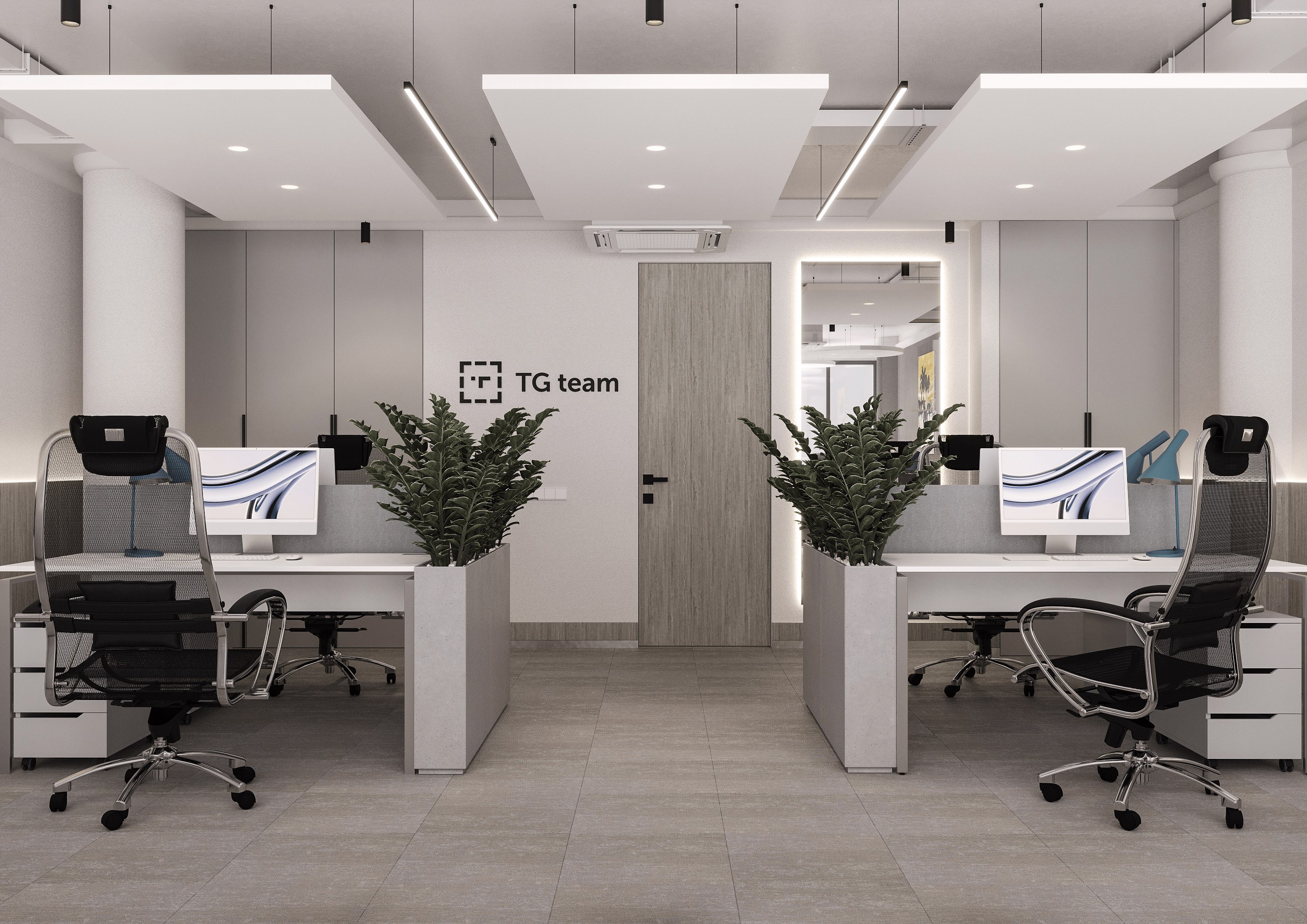 Была проведена полная перепланировка помещения с зонированием на общую рабочую зону и два кабинета руководителей. Смонтированы перегородки из стекла с акустическим эффектом, обеспечивающие приватность при сохранении визуальной лёгкости пространства.