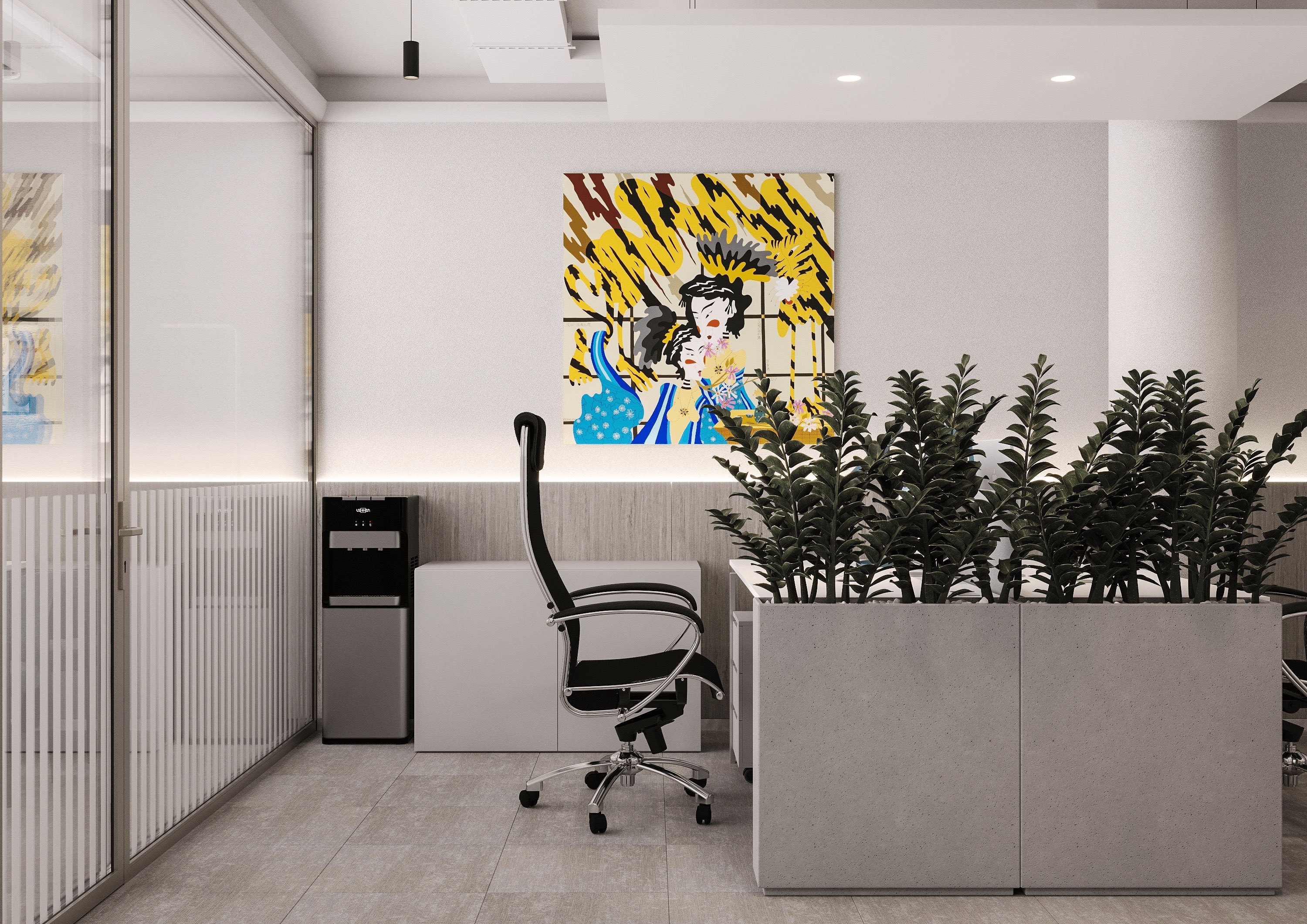 В основе концепции — сочетание лаконичного минимализма и ярких творческих акцентов. Нейтральная палитра серых оттенков дополняется глубоким бирюзовым цветом мягких кресел и выразительными элементами декора: арт-полотном и росписью колонны от художника Светланы Богачёвой, которая становится эмоциональным центром интерьера.