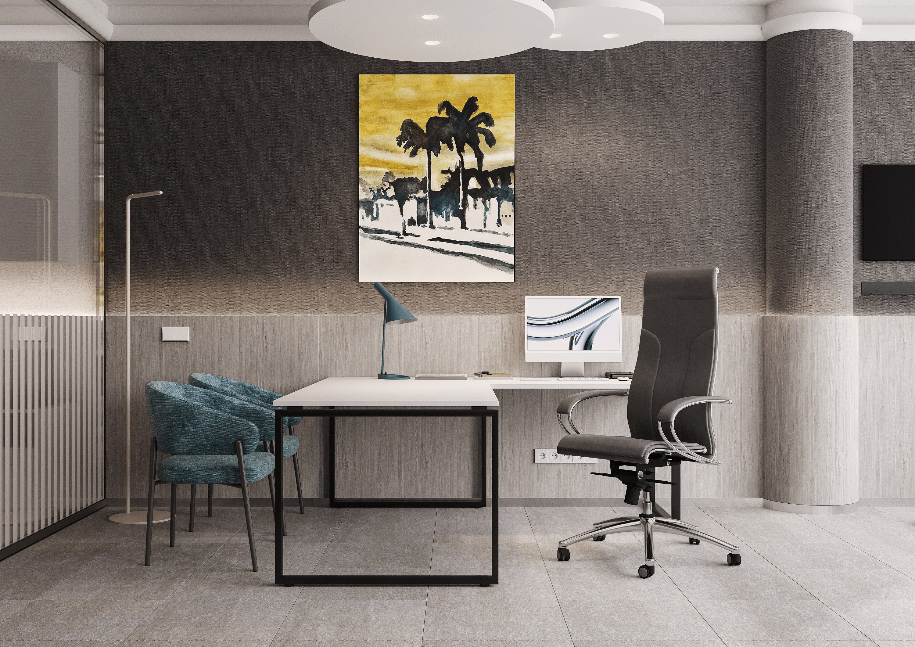 Офис площадью 70 м² разделён на общую зону и два кабинета руководителей, где каждый метр продуман с точки зрения комфорта, эргономики и визуального баланса.