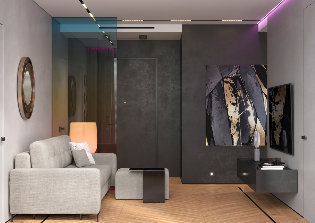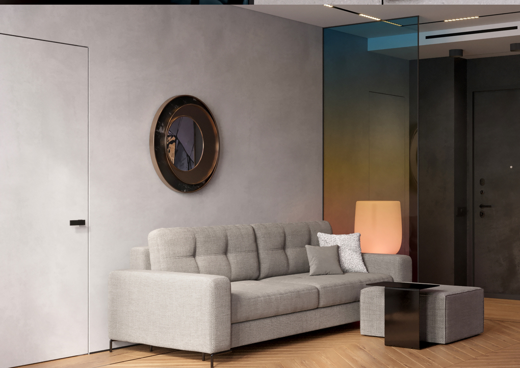 - Изысканное зеркальное панно над диваном работы Льва Ефимова, визуально расширяющее пространство