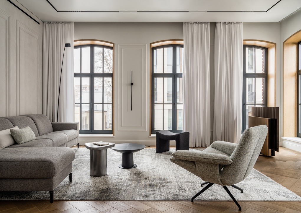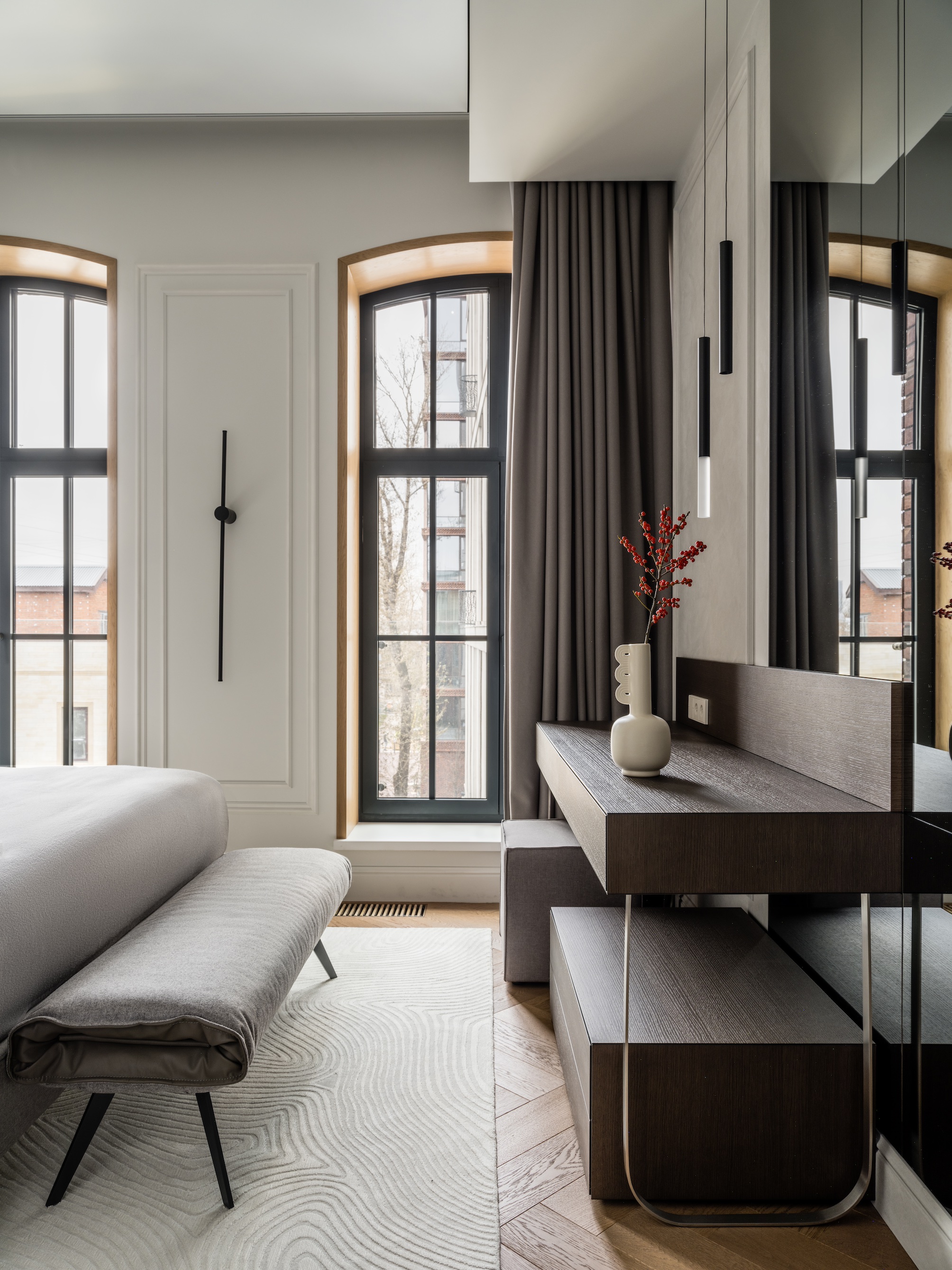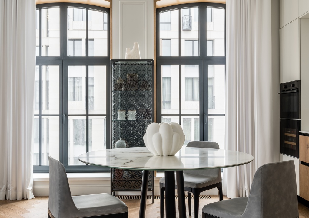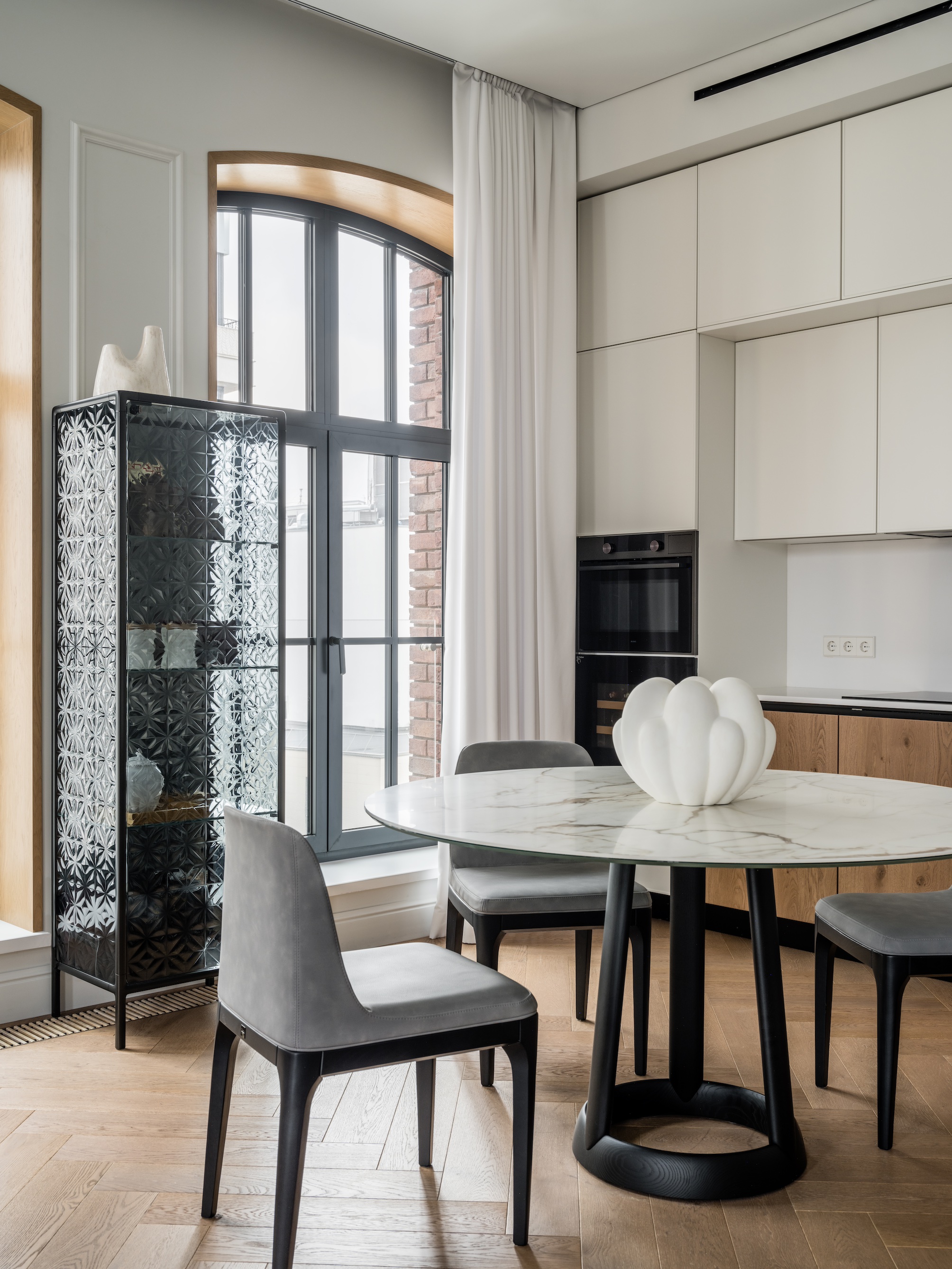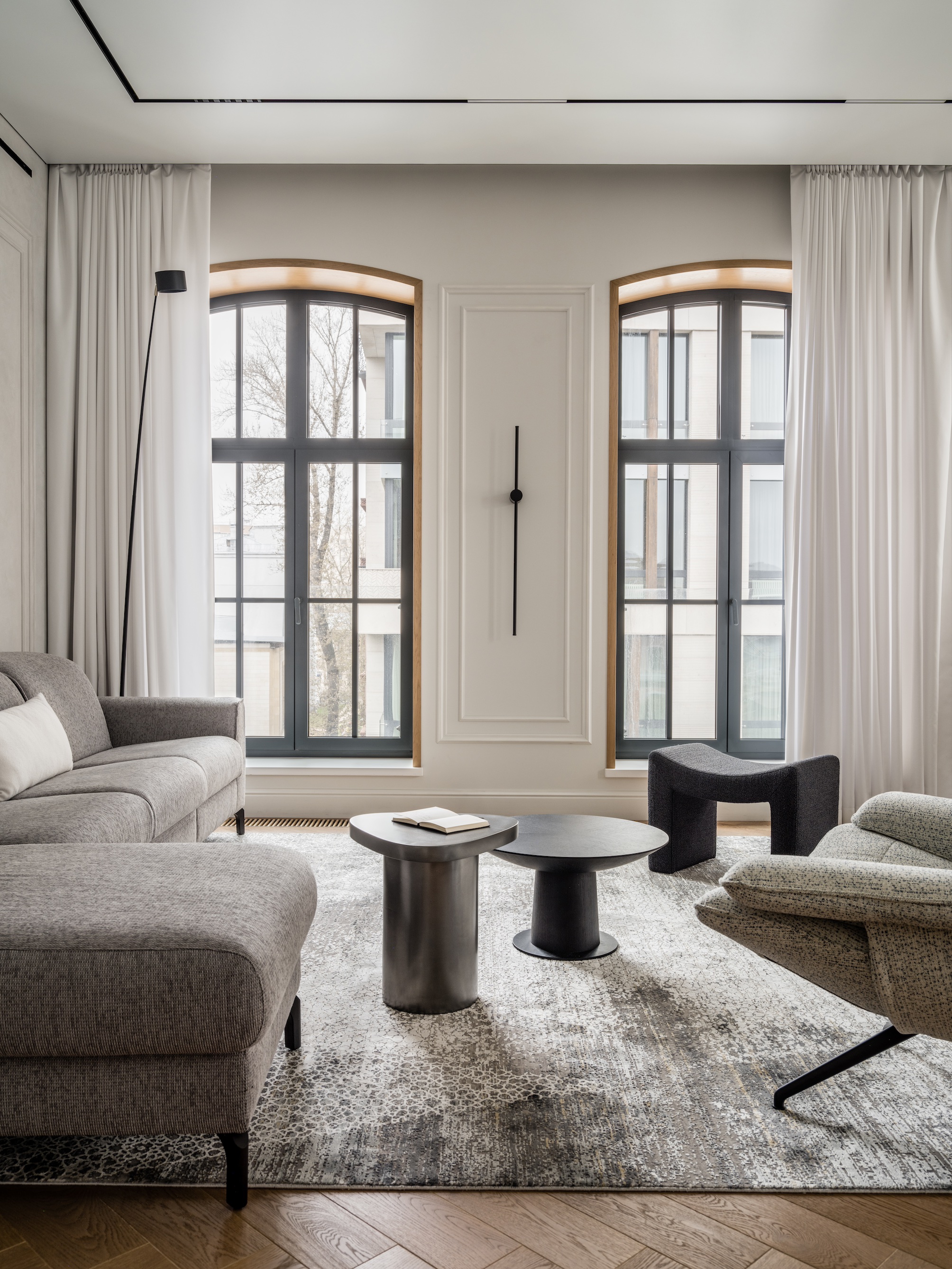 Хозяева квартиры вышли на дизайнера Наталью Петрову, сооснователя студии «Архитекстура», по совету соседей. Для неё этот дом был не в новинку — с его планировками и особенностями она работала уже не раз. Главное очарование и одновременно вызов — арочные окна. Они словно вырезают в стенах мягкие порталы света, делают пространство воздушным, но лишают возможности свободно возводить перегородки.