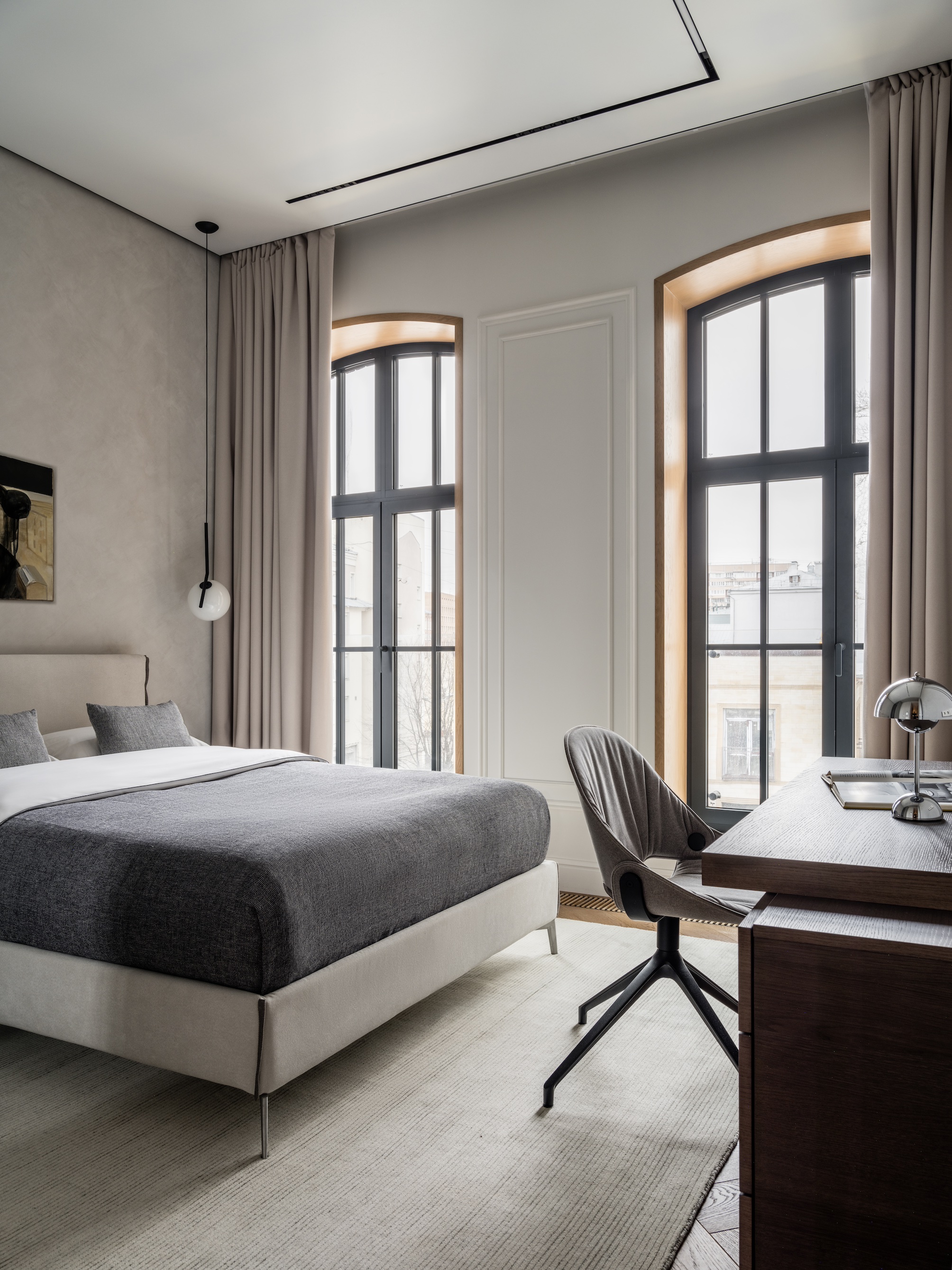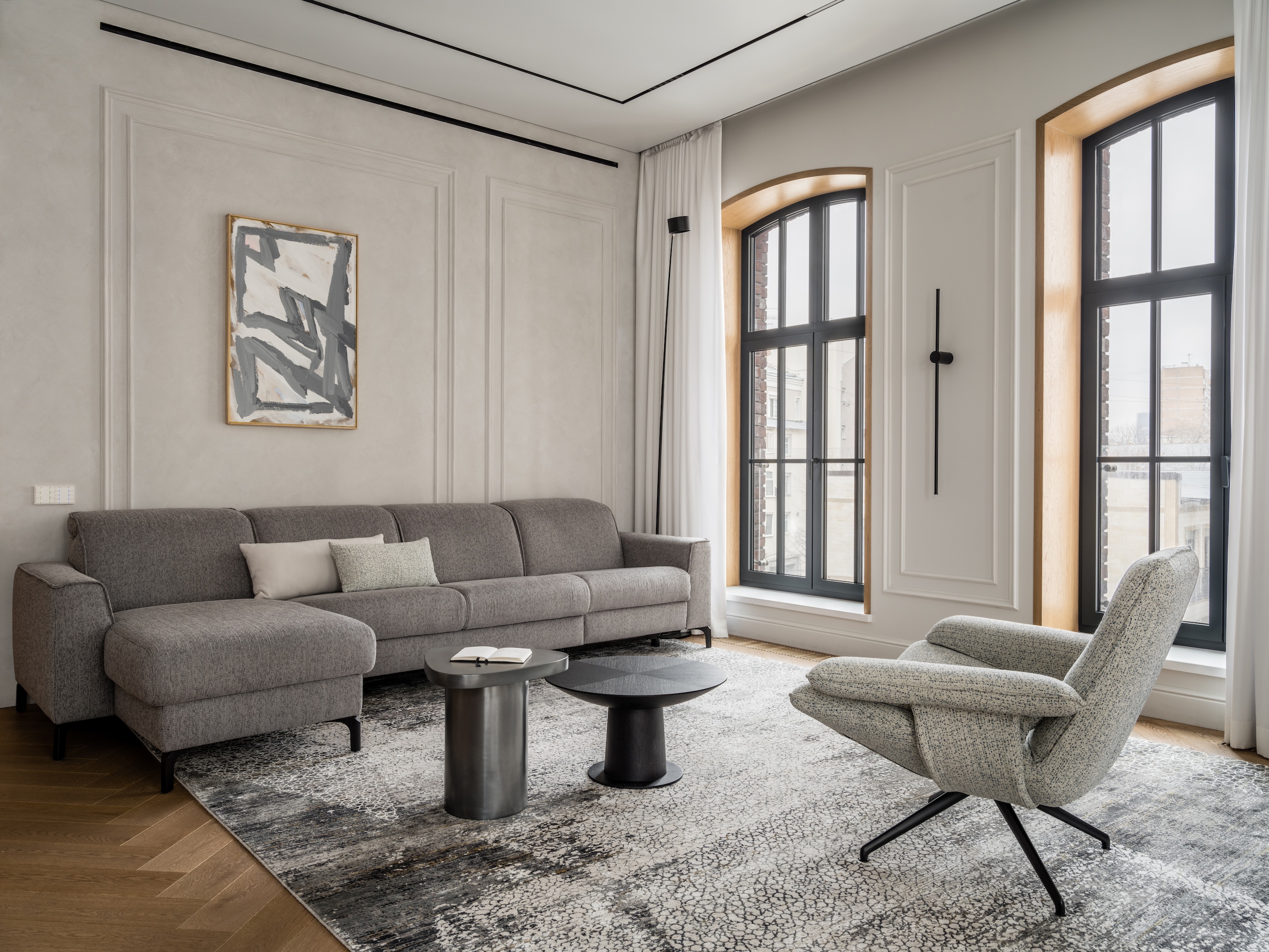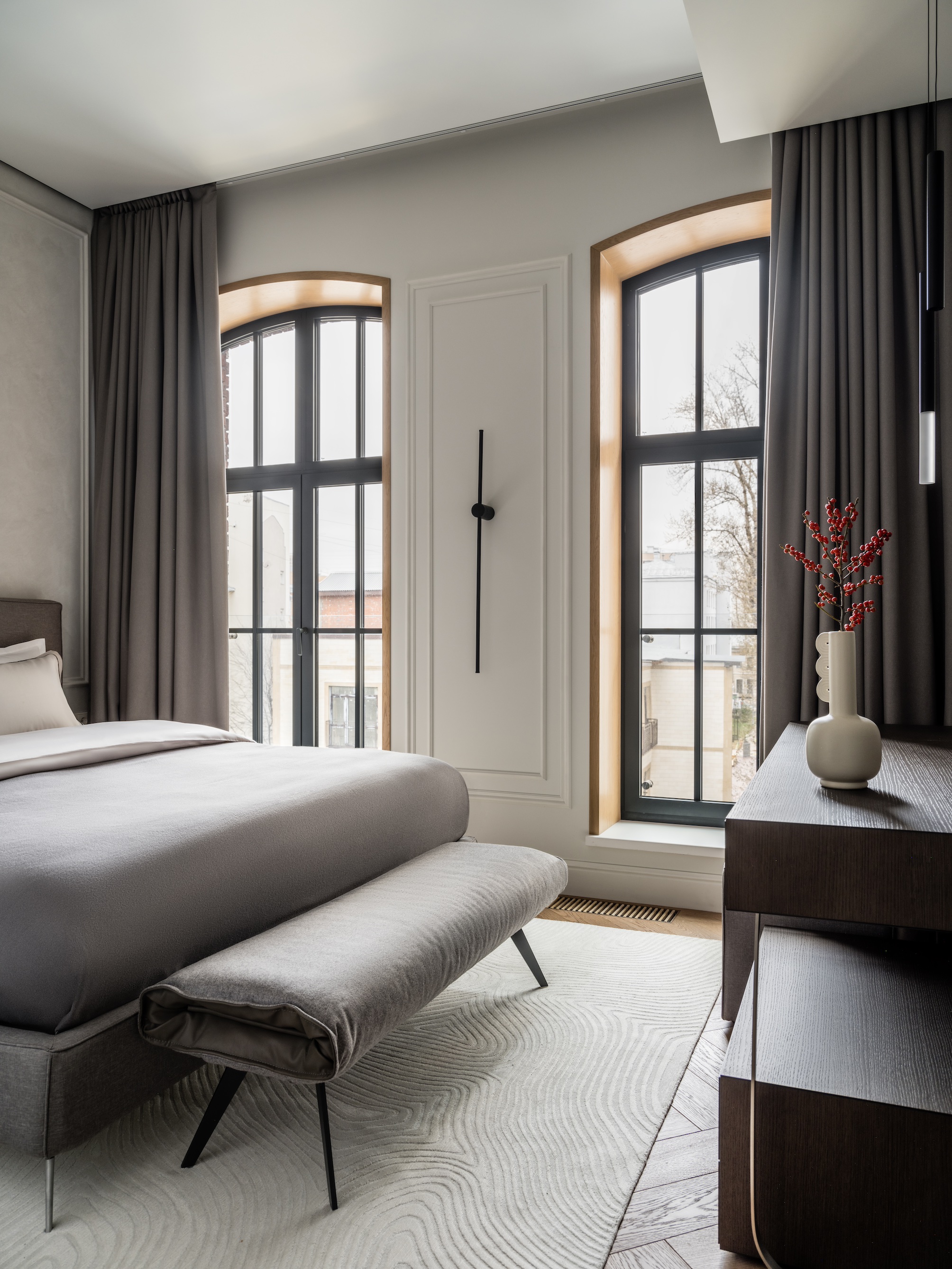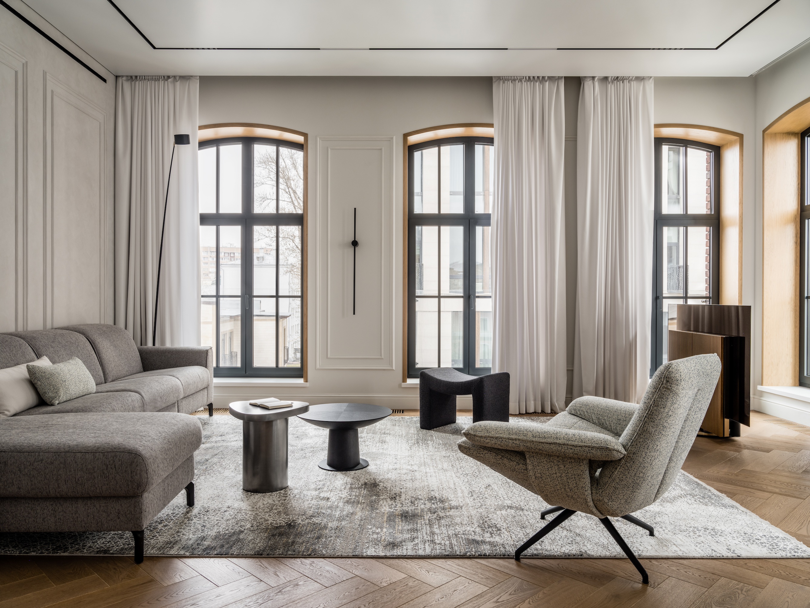 Хозяева квартиры вышли на дизайнера Наталью Петрову, сооснователя студии «Архитекстура», по совету соседей. Для неё этот дом был не в новинку — с его планировками и особенностями она работала уже не раз. Главное очарование и одновременно вызов — арочные окна. Они словно вырезают в стенах мягкие порталы света, делают пространство воздушным, но лишают возможности свободно возводить перегородки.