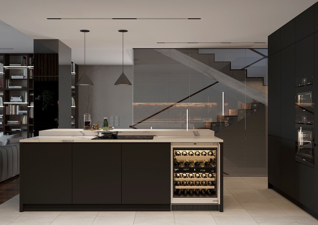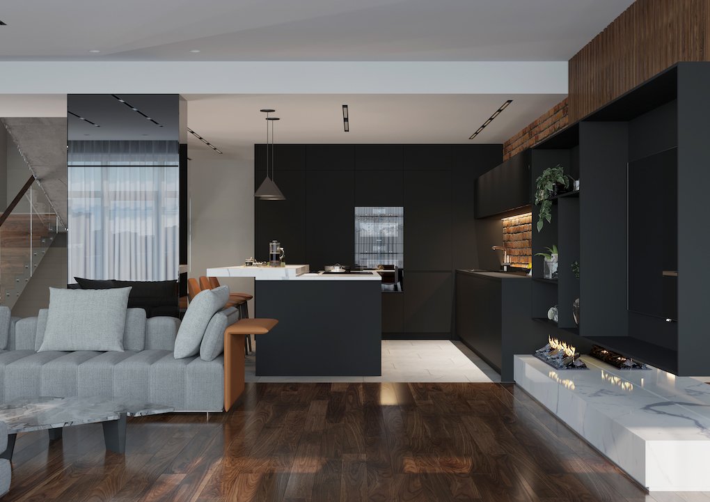 Центральным помещением в квартире выступает кухня-столовая и гостиная. Стеклянной перегородкой с распашными дверьми отделен кабинет (одновременно гостевая спальня).