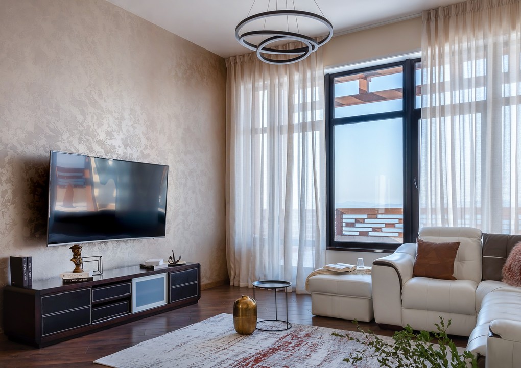 Стилистика интерьера обусловлена близостью моря и прекрасными видамии из окон, особенно с 4-го этажа, на котором расположена мастер-спальня с гардеробной, гостиная с террасой и ванная комната.