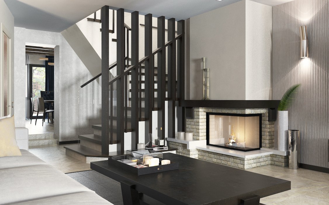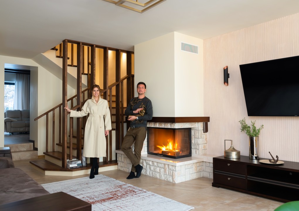 На втором этаже основная гостиная с камином и кухня-столовая. Как раз в нее приходит лифт с 1-го этажа. Удобно с пакетами продуктов оказаться сразу на кухне. Также на этом этаже размещен санузел для гостей.