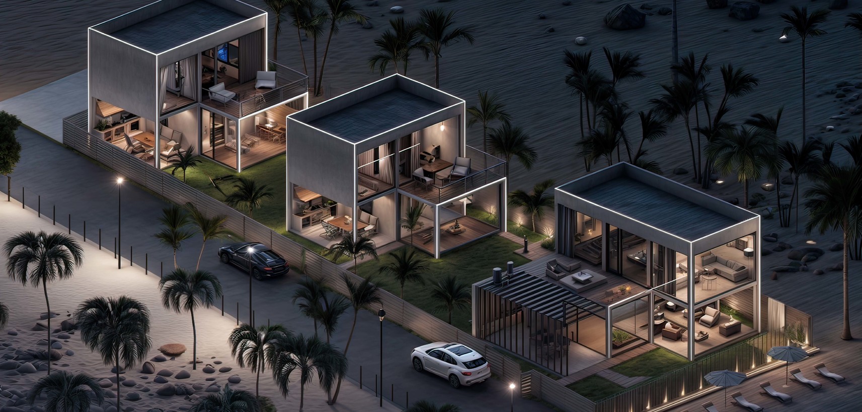 Комплекс включает три отдельно стоящие виллы, каждая из которых продумана до мелочей. Архитектура выполнена в стиле минимализм: чистые линии, простые формы и гармония с окружающим ландшафтом. Панорамное остекление открывает беспрепятственный обзор на море и позволяет максимально наполнить внутренние пространства светом. Утро здесь встречают мягкие каспийские рассветы, а вечера — завораживающие закаты, отражающиеся в стеклянных фасадах.