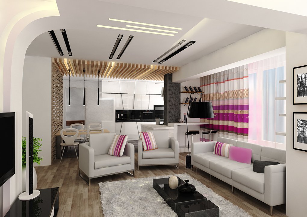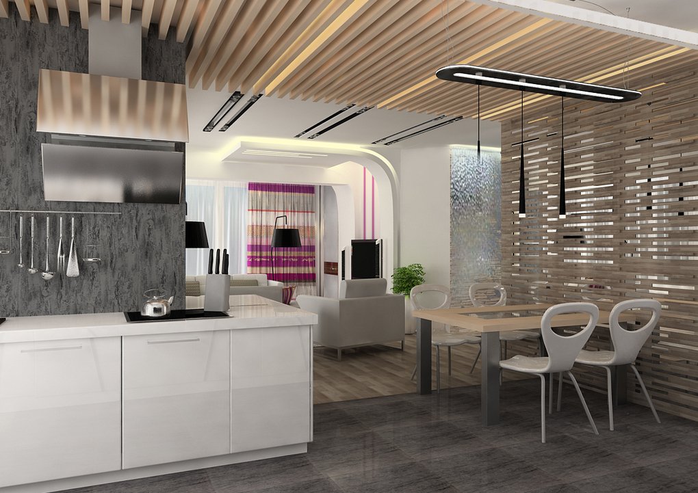 Центральным помещением в квартире выступает кухня-столовая и гостиная. Стеклянной перегородкой с распашными дверьми отделен кабинет (одновременно гостевая спальня). И фиксированной стеклянной перегородкой отделена кухня от пространства коридора. В спальню можно пройти только через одну из гардеробных через "потайную" дверь, спрятанную в поверхности стеновых панелей.