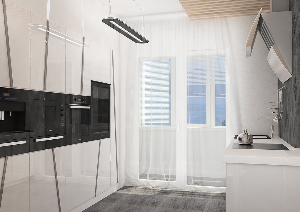 Центральным помещением в квартире выступает кухня-столовая и гостиная. Стеклянной перегородкой с распашными дверьми отделен кабинет (одновременно гостевая спальня).
