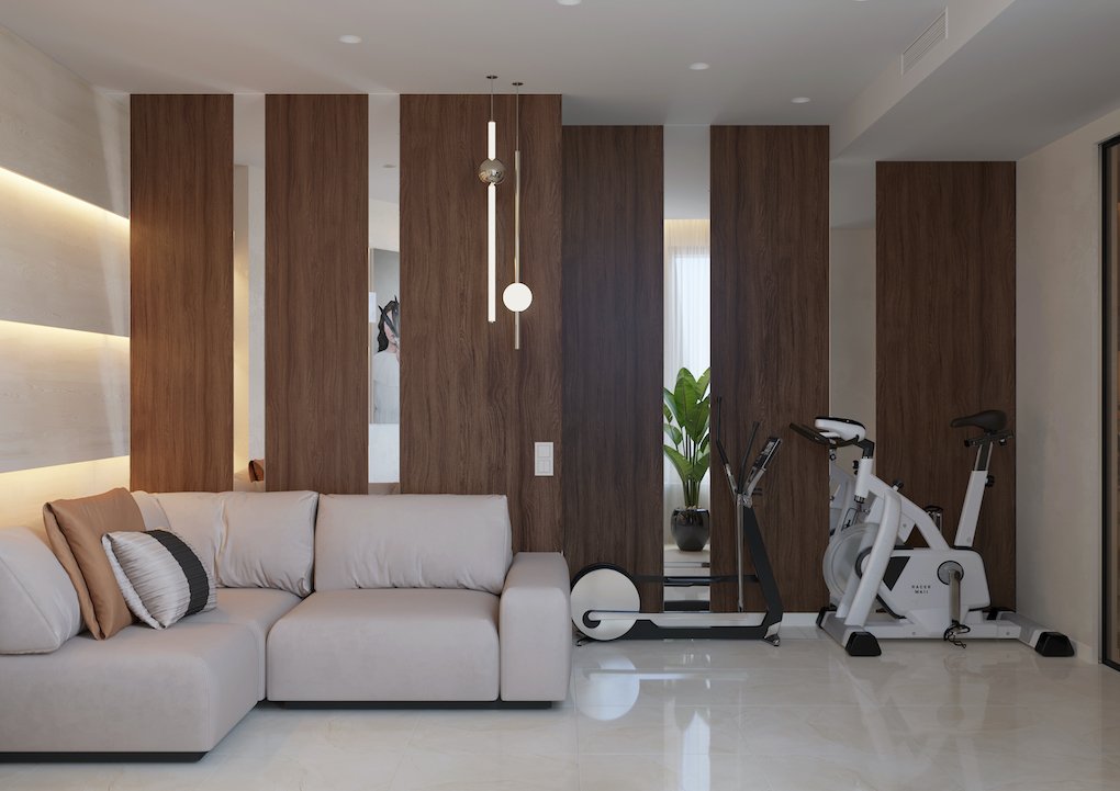 Центральным помещением в квартире выступает кухня-столовая и гостиная. Стеклянной перегородкой с распашными дверьми отделен кабинет (одновременно гостевая спальня). И фиксированной стеклянной перегородкой отделена кухня от пространства коридора. В спальню можно пройти только через одну из гардеробных через "потайную" дверь, спрятанную в поверхности стеновых панелей.