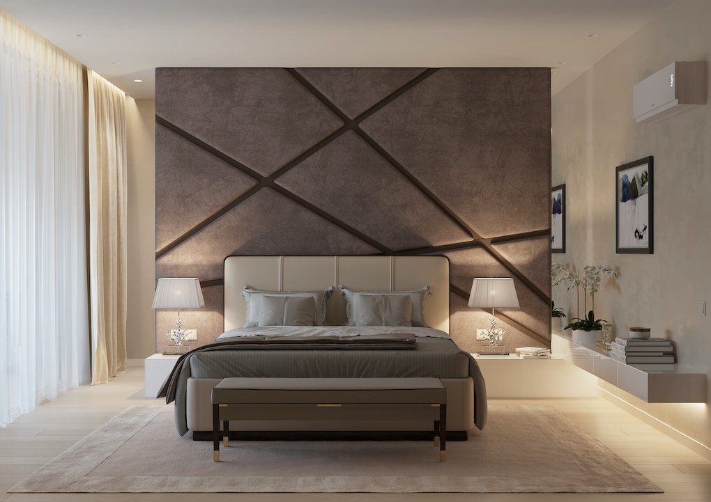 В спальню можно пройти только через одну из гардеробных через "потайную" дверь, спрятанную в поверхности стеновых панелей.