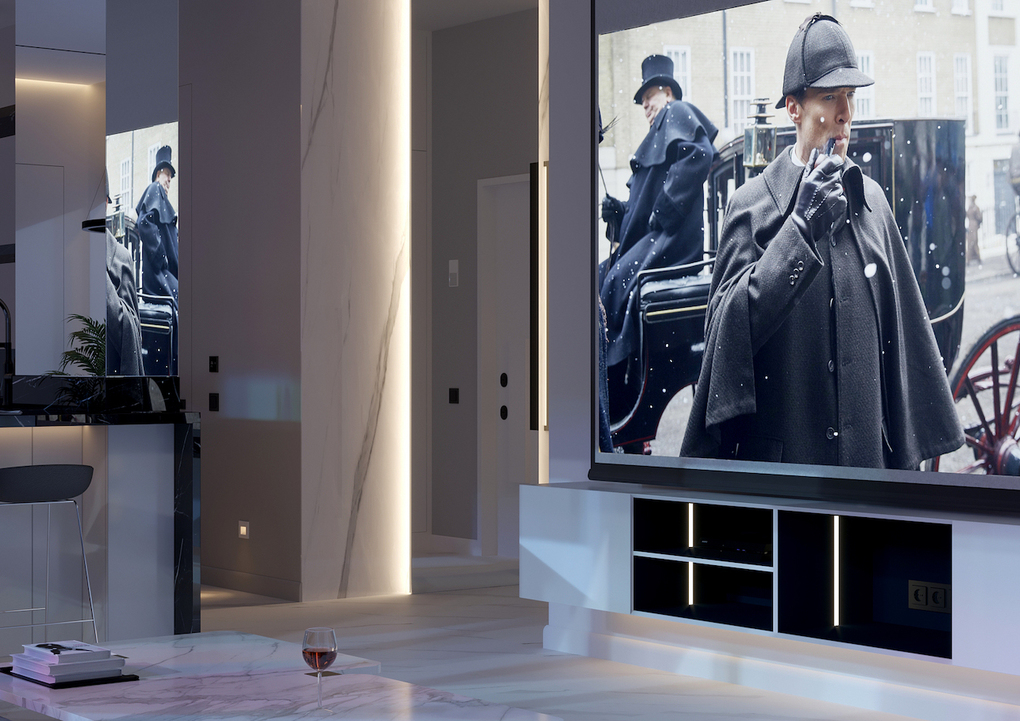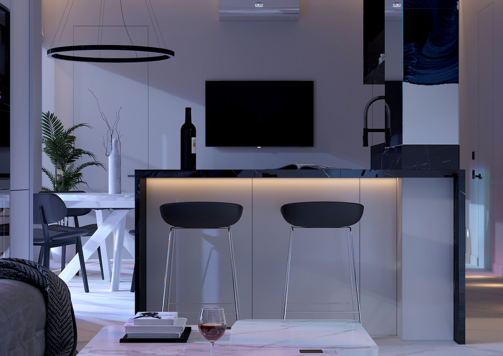 Центральным помещением в квартире выступает кухня-столовая и гостиная. Стеклянной перегородкой с распашными дверьми отделен кабинет (одновременно гостевая спальня). И фиксированной стеклянной перегородкой отделена кухня от пространства коридора. В спальню можно пройти только через одну из гардеробных через "потайную" дверь, спрятанную в поверхности стеновых панелей.
