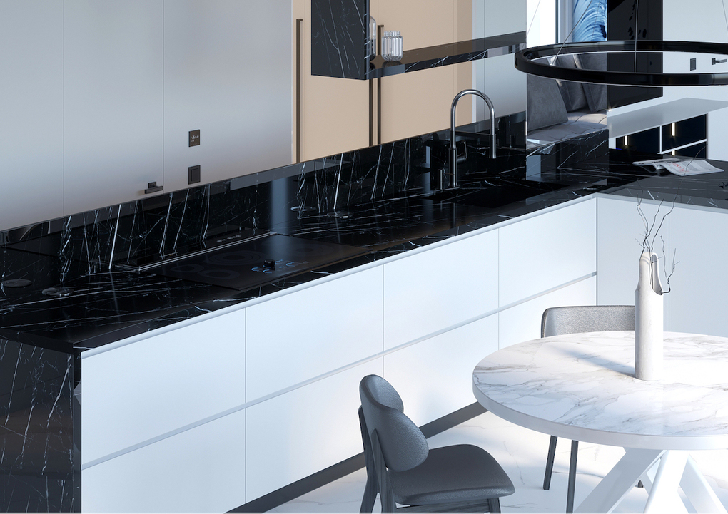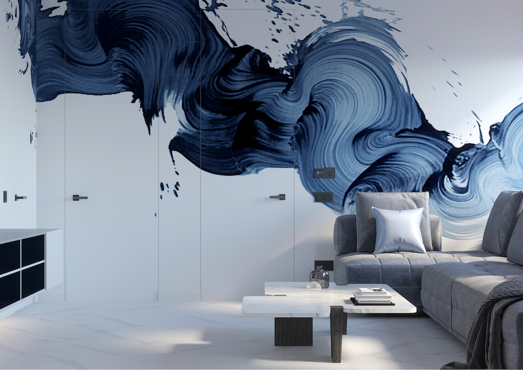 Основная цветовая гамма — монохром. Светло-серые стены, потолок и текстиль, мраморный, черные металлические элементы. Сдержанную и строгую цветовую гамму разбавляет роспись художника на центральной стене!